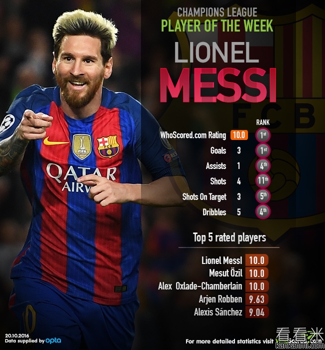 阿根廷人现在以6粒进球领跑欧冠射手榜。此外,在诺坎普的那场胜利,梅西还用他的一次关键传球为自己赢得了一个助攻的数据,并且还送出了5次成功过人、2次抢断和3次造犯规,29岁的梅西本周的表现绝对是配得上进入最佳阵容的。