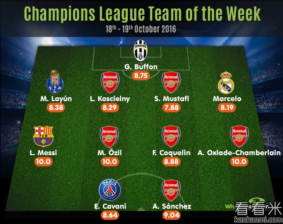 著名足球数据网站WhoScored.com评选出的本周欧冠最佳阵容当中,阿森纳球员占据了主导位置,他们共有6名球员成功入选。枪手本周欧冠小组赛在主场6-0大胜卢多戈雷茨,厄齐尔和张伯伦更是在赛后获得了WhoScored所评出的10分的满分,双双跻身最佳阵容。其中厄齐尔在本场比赛收获了他职业生涯的首个帽子戏法,并且还送出了他自2014年4-1战胜加拉塔萨雷以来的第一个欧冠助攻。