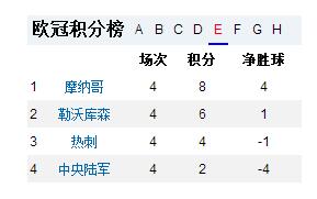 E组的形势仍然较复杂,热刺主场输掉比赛后落到了小组第三,出线岌岌可危。中央陆军积2分仍有理论上的出线可能。