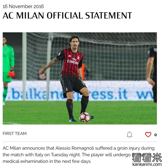 北京时间今天凌晨,AC米兰官方宣布球队中卫罗马尼奥利腹股沟拉伤,他将在未来几天接受进一步的检查。