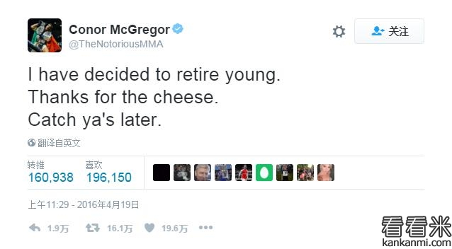 第七:MMA 康纳-麦格雷戈 推文:我决定提前退役,感谢所有人!咱们回见!