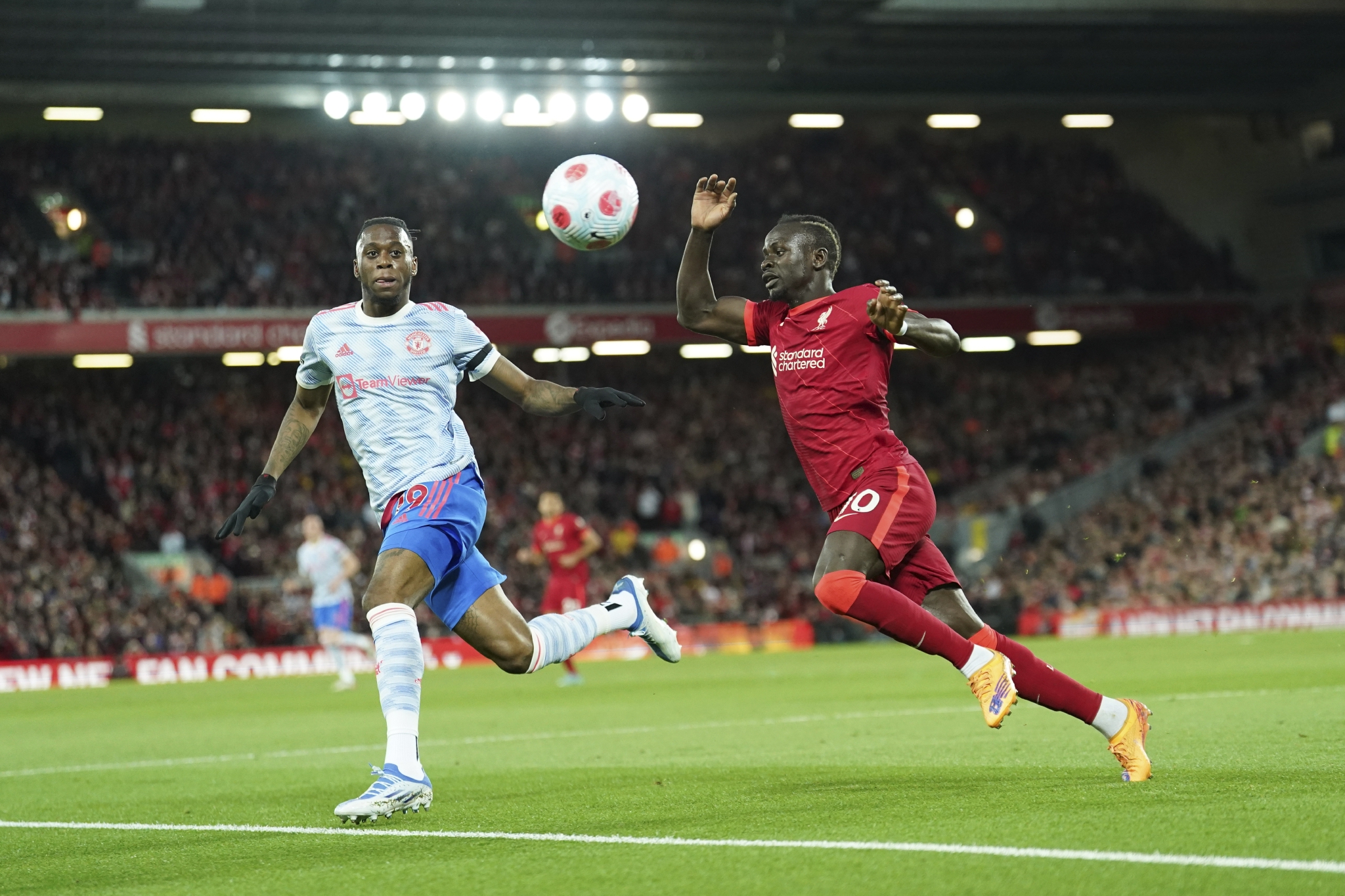 4月19日,利物浦队球员马内(右)和曼彻斯特联队球员万-比萨卡拼抢.