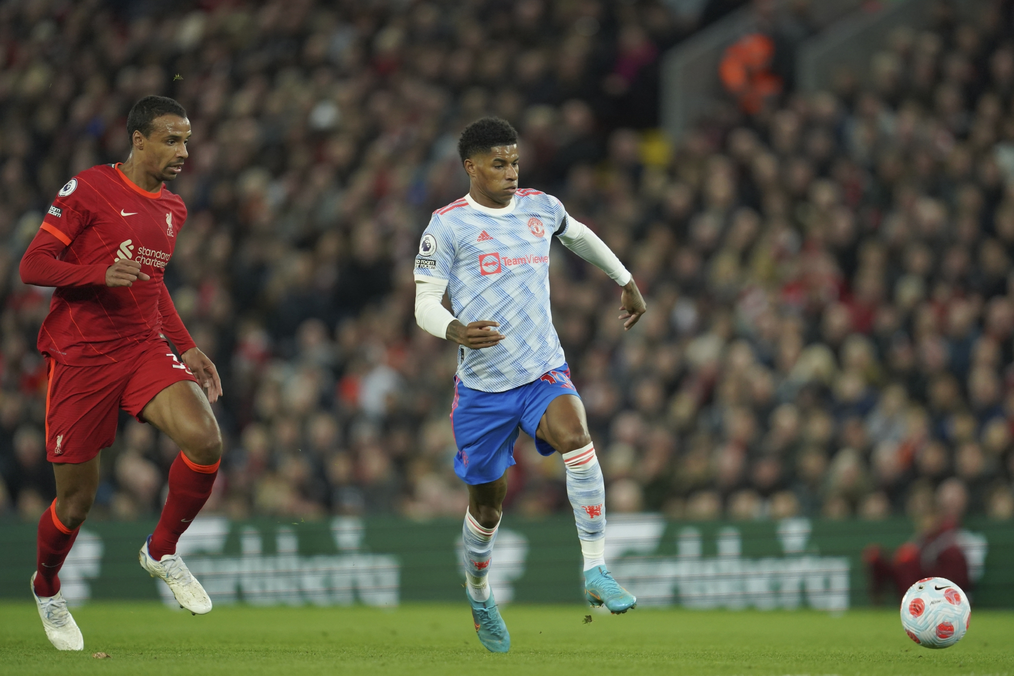 4月19日,利物浦队球员马蒂普和曼彻斯特联队球员拉什福德(右)拼抢。