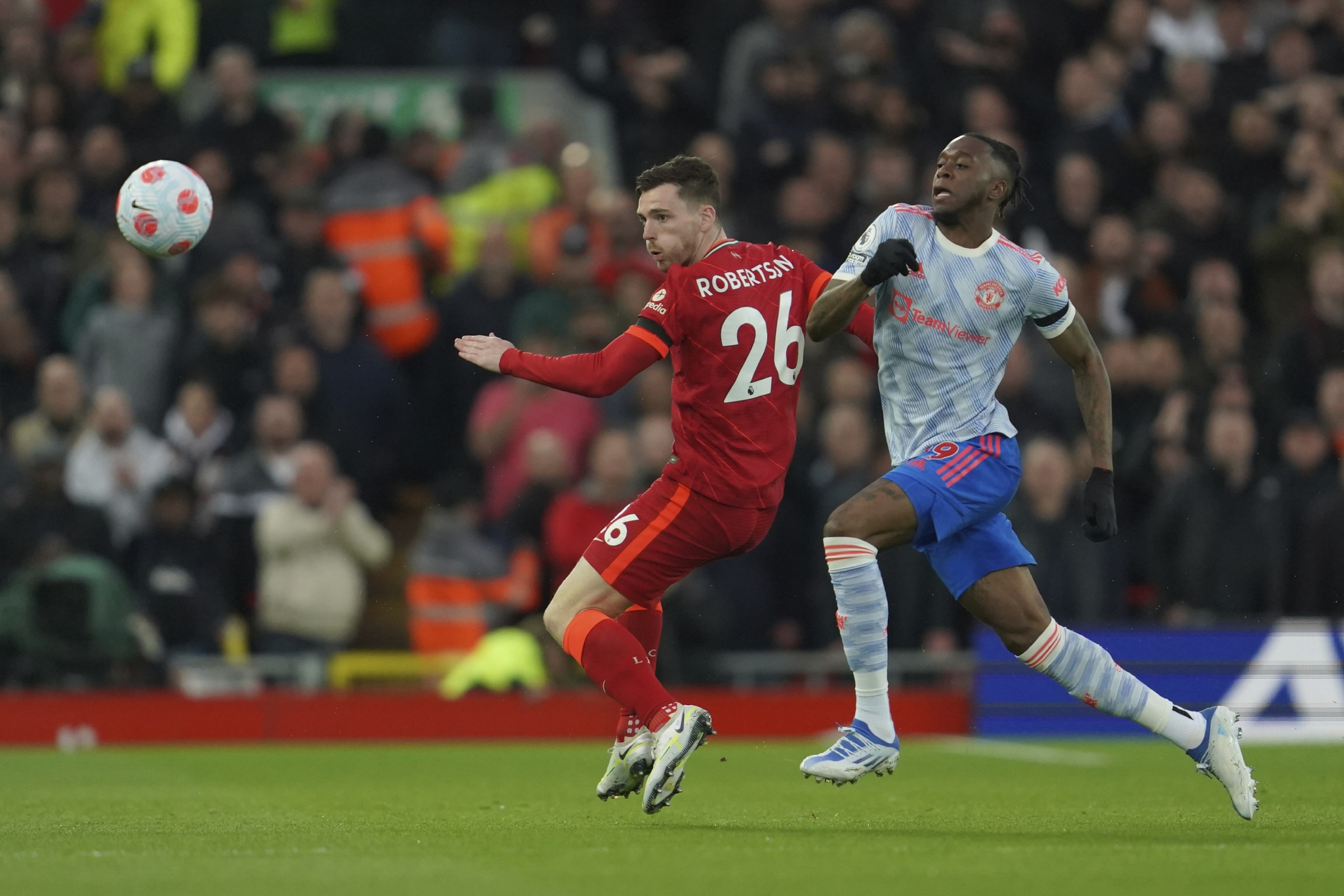 4月19日,利物浦队球员罗伯逊(左)和曼彻斯特联队球员万-比萨卡拼抢。