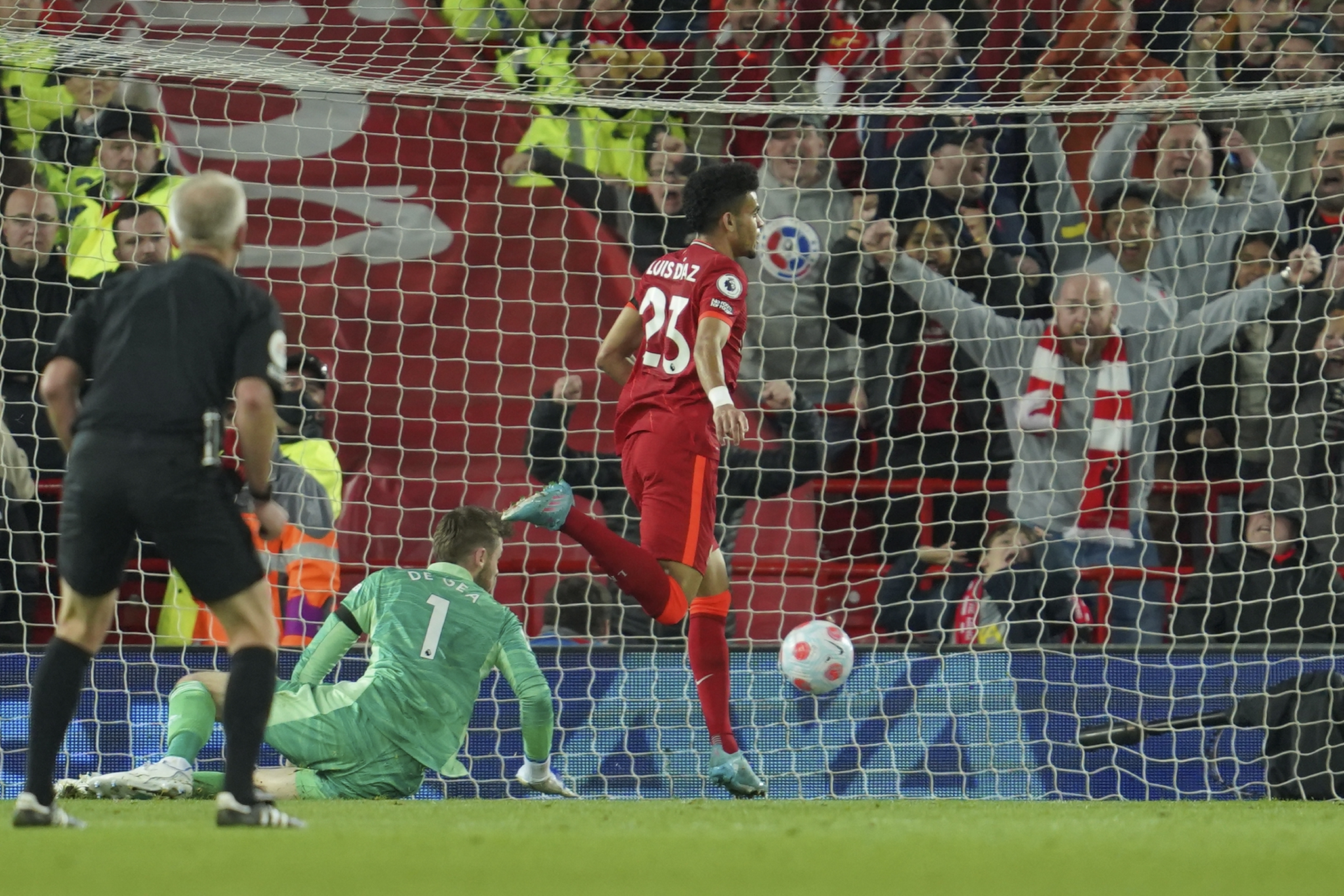 4月19日,利物浦队球员迪亚斯(右)攻入一球。