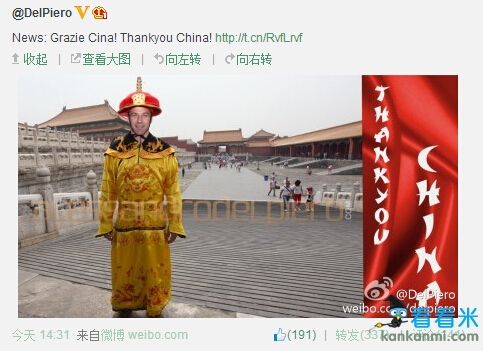 皮耶罗中国行以黄袍加身结束 变身皇族双语感谢中国